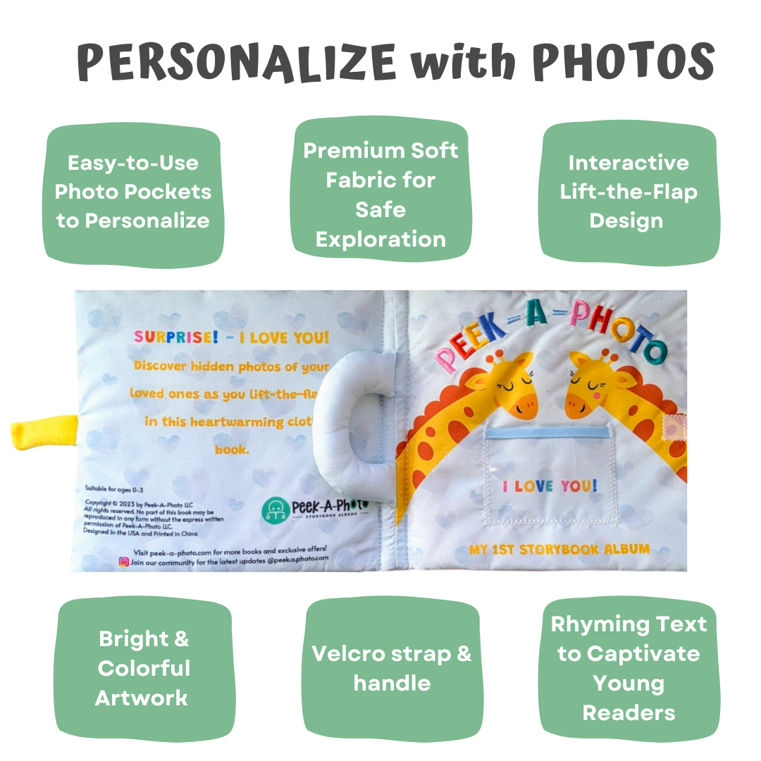 Introduce your baby to the wonderful world of reading with our soft cloth peekaboo storybook album designed for ages 0-3. Think peek-a-boo with family photos, where little ones discover you behind interactive flaps! This fabric book combines the safety and comfort of cloth materials with the excitement of discovering loved ones. Each lovingly crafted page features a delightful lift-the-flap surprise, revealing five hidden photo pockets for: Mommy, Daddy, Grandma, Grandpa, & a Loved One (single or group).